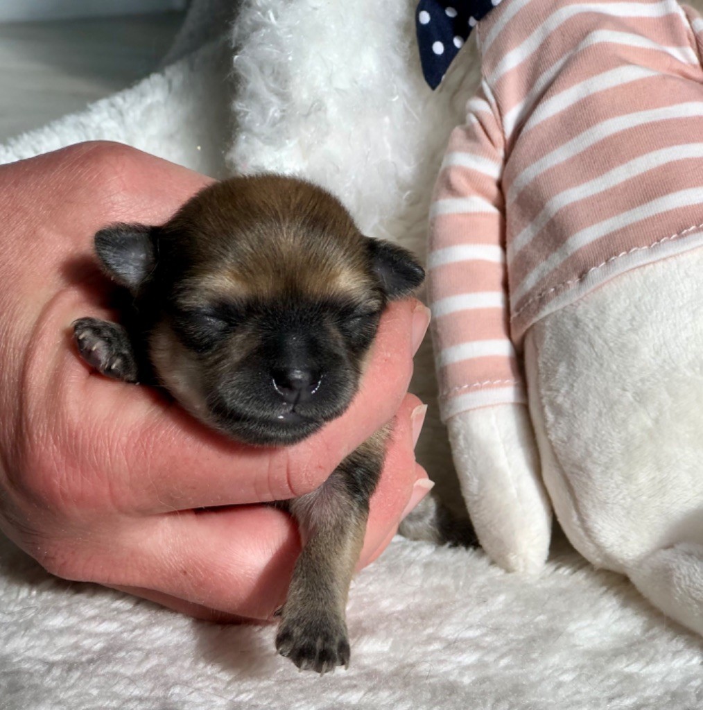 La plus petite puce de la portée poids de naissance 94g. Fauve charbonné. Sa couleur va beaucoup évoluer.